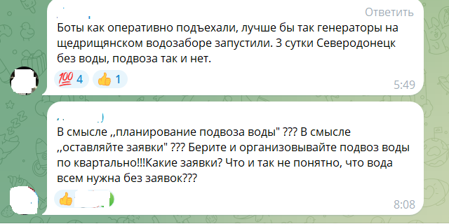 Северодончане жалуются на вторые сутки без капли воды и третий год - без связи, что делает даже подачу заявки на подвоз воды невозможной.