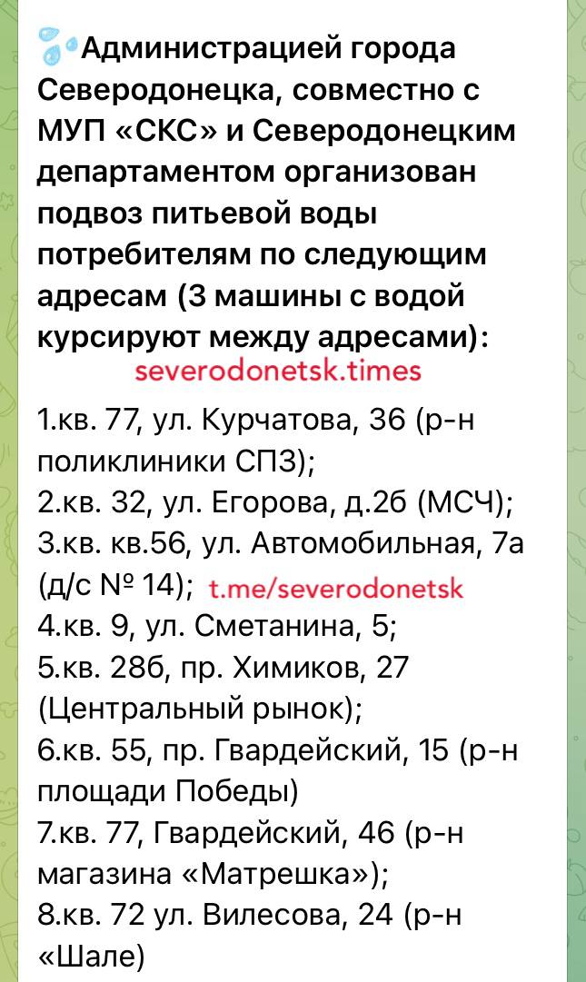 По заявлению так называемой "администрации" города, совместно с МУП "СКС" и "департаментом" Северодонецка были задействованы три машины с питьевой водой, которые курсируют только между восьми адресами.