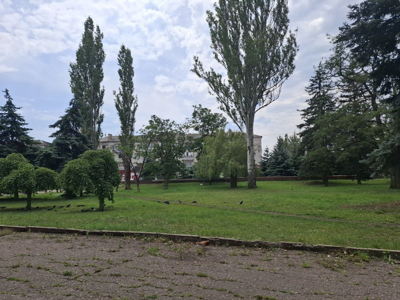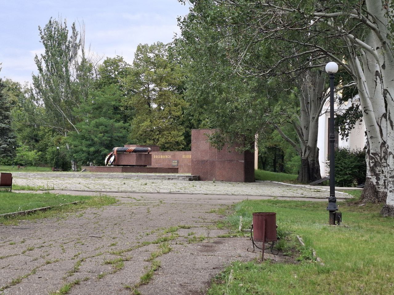Мемориал "Памяти павших" стоит заброшенный — еще в начале мая его наскоро подлатали для праздничных фото на российскую пропаганду, а уже через несколько недель снова оставили на произвол судьбы. Из-под тротуарной плитки у памятника пробивается трава, но все же траву у сквера покосили.
