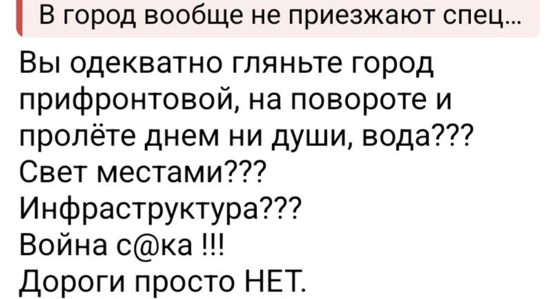 "Как за услуги платить — мы не прифронтовый, как что-то для людей — то мы прифронтовый. Это касается медицины, связи, дорог. С РТИ до центра доехал — подвеска дважды чуть не отпала!"