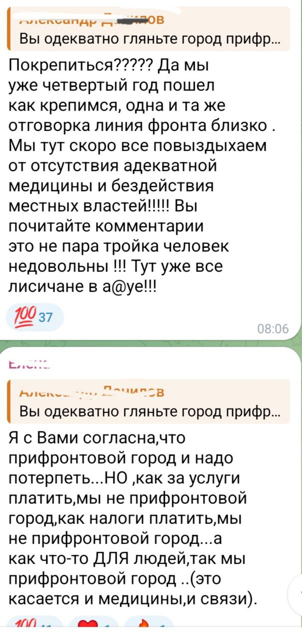 "Покрепиться???? Но мы уже четвертый год крепимся. Отсутствие медицины, бездействие власти! Вы почитайте комментарии — это не пара-тройка людей недовольных. Здесь уже все лисичане в а@уе!"