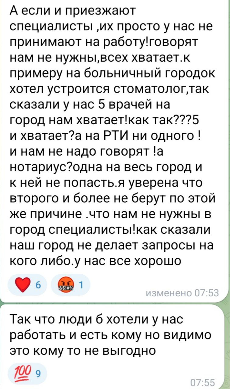 "На больничный городок хотел устроиться стоматолог – сказали, у нас 5 врачей на город, нам хватает! А на РТИ — ни одного, и говорят, что не надо. Нотариус одна на весь город, в нее не попасть. Говорят, город не подает запросов, у нас все хорошо..."