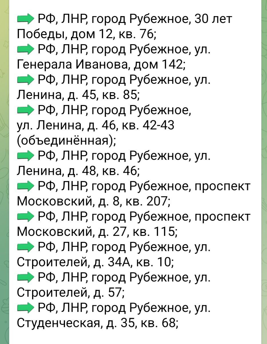 В оккупированном Рубежном Луганской области российская "администрация" продолжает массовое присвоение чужого жилья. Под прикрытием так называемого "закона ЛНР" от 2024 года, оккупационные власти публикуют списки квартир и домов, которые они собираются оформить как "бесхозяйное имущество" - то есть фактически отобрать у законных владельцев.