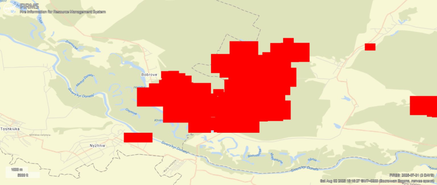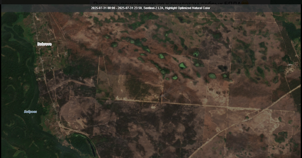Серия масштабных пожаров, вспыхнувших вблизи оккупированного Боброво (Северодонецкий район Луганской области), охватила, по заявлениям оккупационного "правительства ЛНР", более 310 гектаров лесных и приусадебных территорий. Огонь бушевал с 29 по 31 июля, вплотную подбираясь к жилым кварталам населенного пункта.