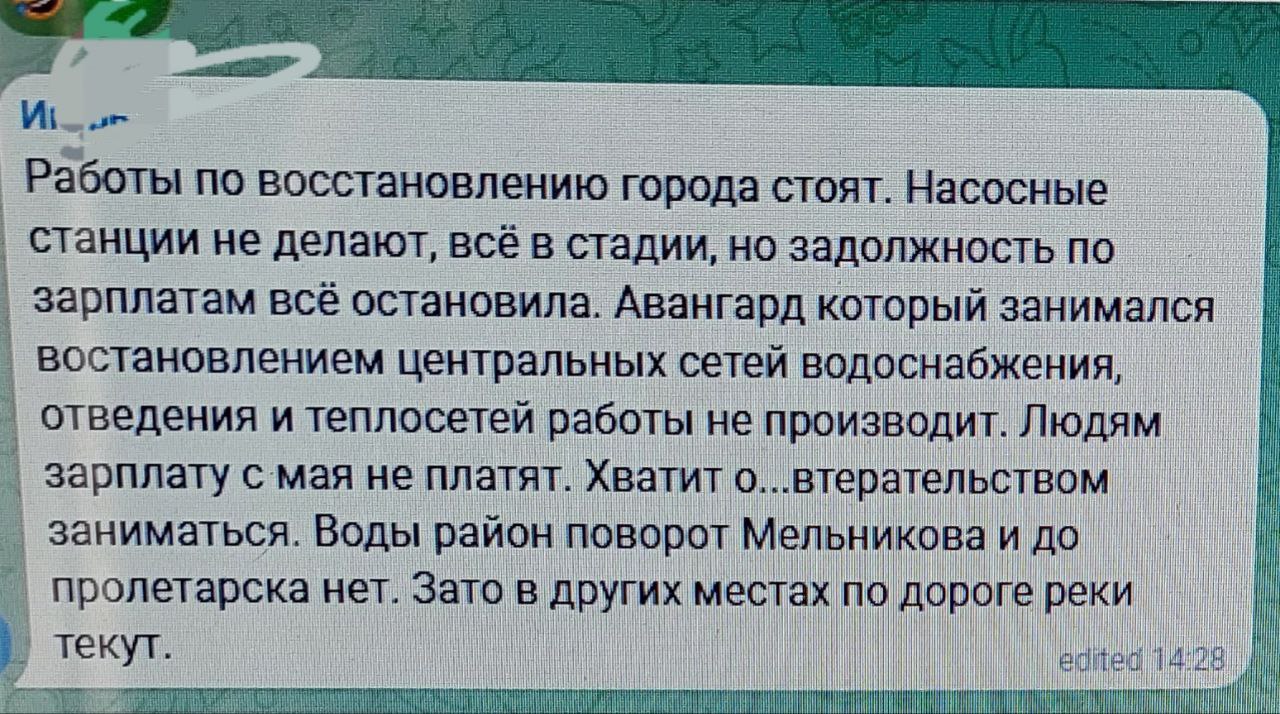В официальных сводках рассказывают и о "масштабном восстановлении" — новой насосной станции, подключении водопроводных сетей и оперативном устранении порывов. Однако реальная картина совсем другая. Под теми же публикациями жители пишут об остановке работ, задолженности по зарплате и отсутствии прогресса: