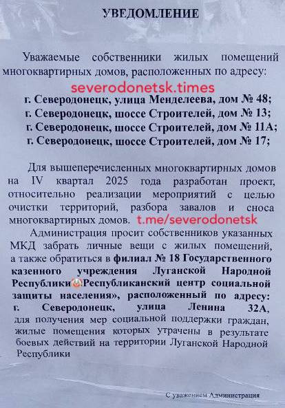 Демонтаж четырех домов на ул. Николая Амосова и шоссе Строителей в Северодонецке, объявленный на IV квартал, является еще одним шагом в этом процессе. Это подтверждает курс оккупантов на переформатирование городского пространства, игнорируя права собственности и потребности законных жителей.