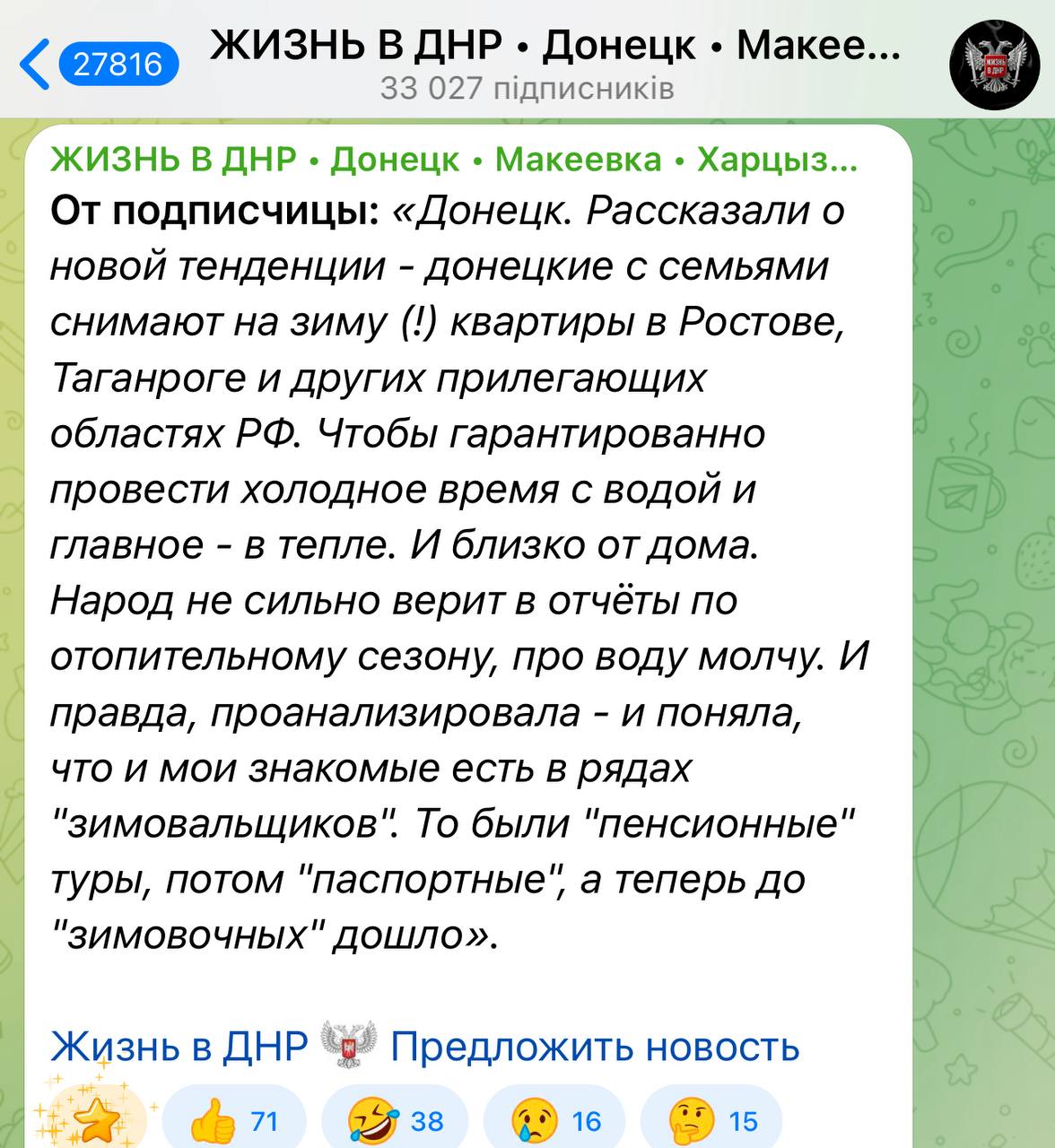 Из-за отсутствия водоснабжения и неопределенности теплоснабжения жители оккупированного Донецка массово готовятся к выезду на зиму. Не веря обещаниям оккупационной администрации, они ищут временное убежище в соседних городах России, таких как Ростов и Таганрог, где арендуют жилье, чтобы гарантированно провести зиму в тепле и с водой.