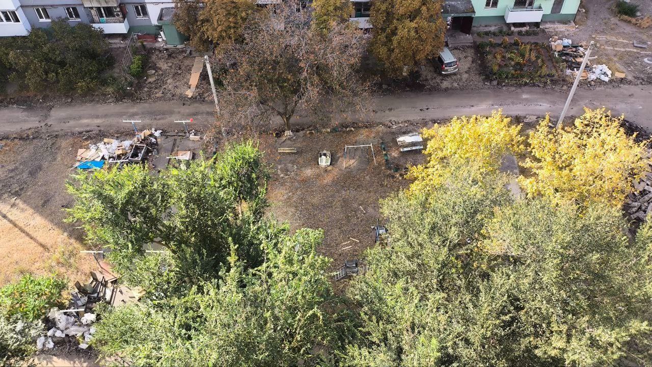 Один из дворов многоквартирного дома превратился в сплошное месиво из перекопанного грунта, щебня и строительного мусора. Прямо у входа в подъезд - ямы и кучи земли вперемешку с отходами. В стороне хаотично свалены изношенные автомобильные покрышки, которые даже не используются как ограждения или клумбы - они просто брошены среди беспорядка.