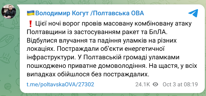 Россия в ночь на 2 октября нанесла комбинированную атаку по Полтавской области, применив ракеты различных типов и ударные беспилотники. По предварительной информации, основной целью могли быть объекты энергетической инфраструктуры.