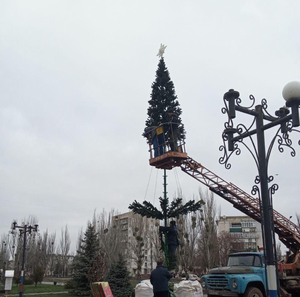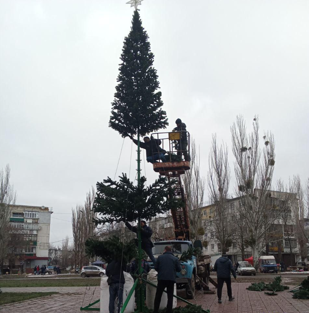 На фото показан процесс установки новогодней елки. Примечательно, что установлена она не на центральной площади, а на РТИ. Вероятно, это связано с тем, что центр города сильнее пострадал из-за обстрелов и использовать фото новогодней елки в качестве пропагандистских материалов было бы затруднительно.