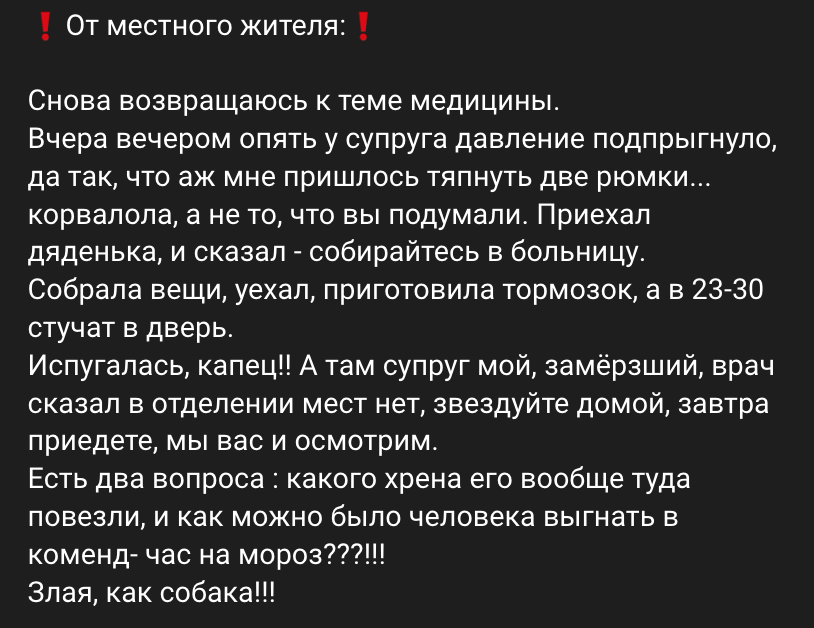 Пользовательница сети сообщила, что вызвала мужу "скорую". "Скорая" приехала, забрала мужчину, а потом, в 23:30 пациент вернулся домой. Вернее, из больницы его выгнали на улицу, потому что мест в отделении нет. В это время в городе уже действует комендантский час. Поэтому мужчине повезло добраться домой из больницы без "последствий".