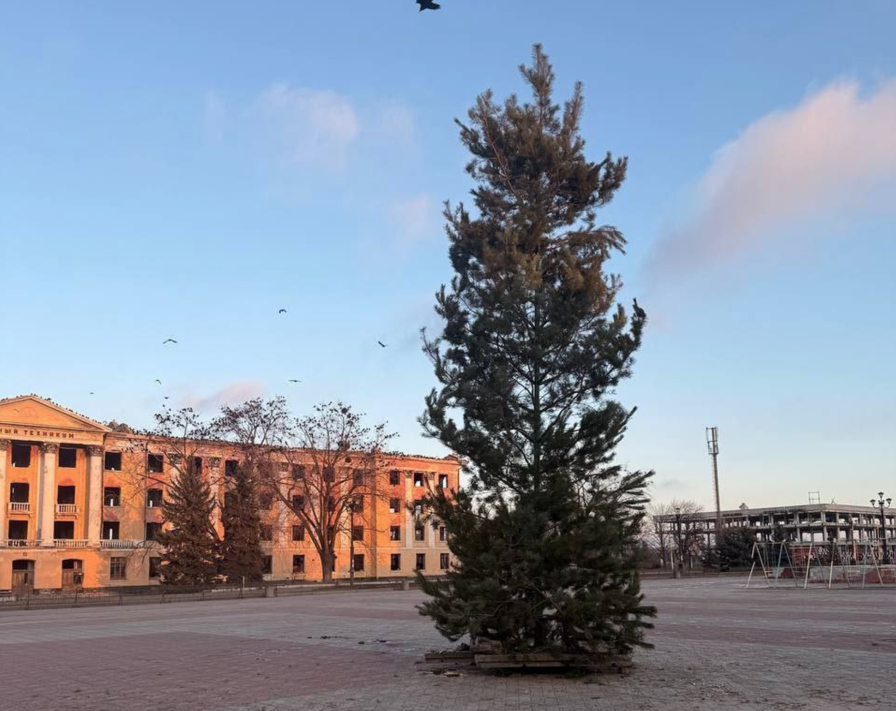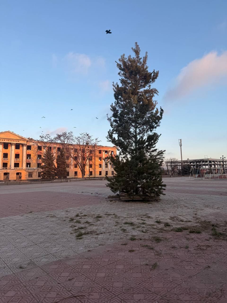 Внимания заслуживает и обстановка вокруг площади Победы. Фоном служат руины - разрушенный техникум, сгоревший супермаркет. На улице пусто - ни прохожих, ни автомобильного движения. Новогодней атмосферы нет.