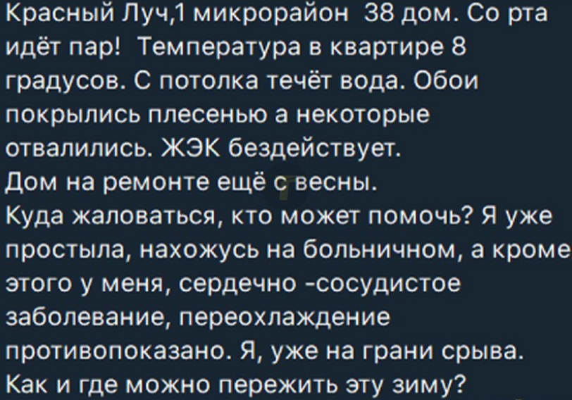 Так, в 38 доме на 1-м микрорайоне ремонт идет с весны. Однако до сих пор нет отопления, а с потолка квартир протекает вода. По словам одной из жительниц, у нее в квартире сейчас всего 8 градусов тепла.