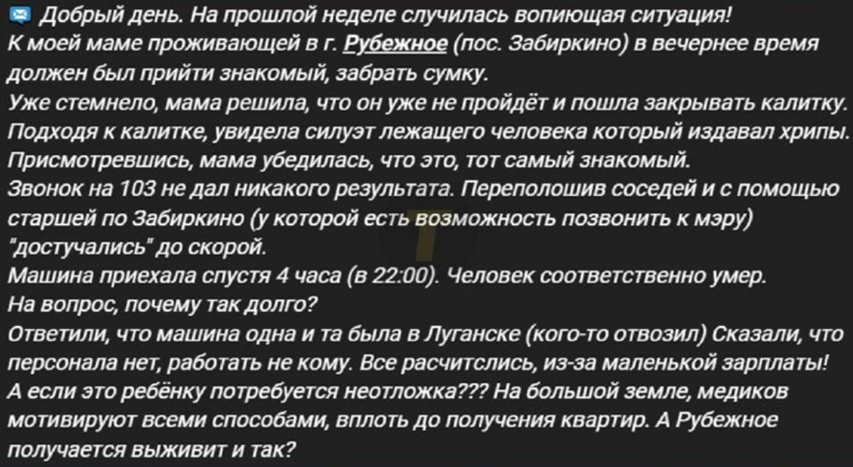 А на вопрос "почему так долго ехали?" ответили, что машина ехала из Луганска, а в Рубежном медиков почти нет - все уволились из-за маленькой заработной платы.