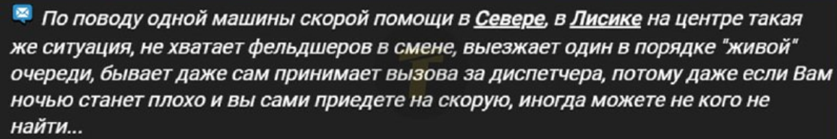По словам жительницы Забиркино, одному из мужчин стало плохо, но вызвать "скорую" не смогли. По итогу, пришлось идти к "старшей" по населенному пункту, чтобы связаться с "властями" и только так вызвать медиков. Однако, как пишет женщина, медики приехали только через 4 часа. К этому времени мужчина умер.