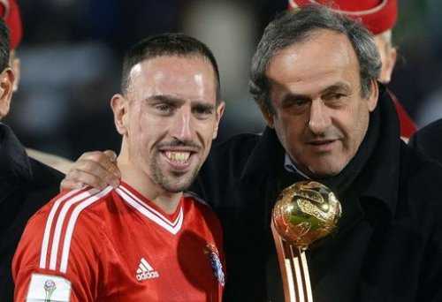 21 декабря. Марракеш. Президент УЕФА Мишель ПЛАТИНИ вручает своему соотечественнику Франку РИБЕРИ приз самого ценного игрока клубного чемпионата мира-2013. Фото AFP "СЭ" завершает представление претендентов на "Золотой мяч"-2013. Вслед за Криштиану Роналду и Лионелем Месси на очереди Франк Рибери.