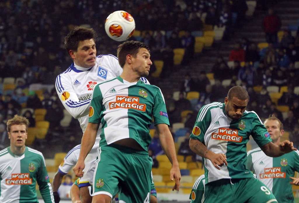 Начиная с сезона 2015\2016, число представителей украинского чемпионата в еврокубках может быть сокращено с 6 до 5. Полузащитник киевского Динамо Огнен Вукоевич (в центре) в матче против венского Рапида в Лиге Европы.