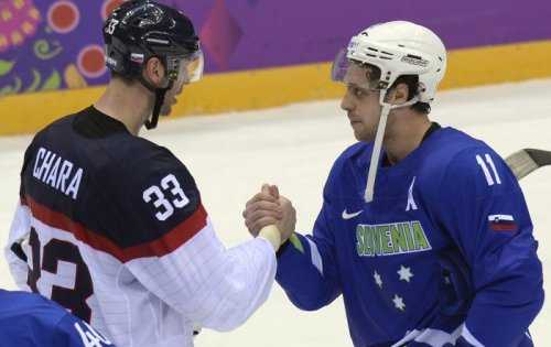 Вчера. Сочи. Словакия - Словения - 1:3. Самый высокий игрок НХЛ словак Здено ХАРА (слева) поздравляет лидера словенской сборной Анже КОПИТАРА. Фото AFP "СЭ" представляет анонс четвертого игрового дня мужского олимпийского турнира. В воскресенье очередными четырьмя матчами завершается групповой турнир, и по итогам этого игрового дня будут сформированы окончательные расклады для дальнейшей борьбы за олимпийские награды.