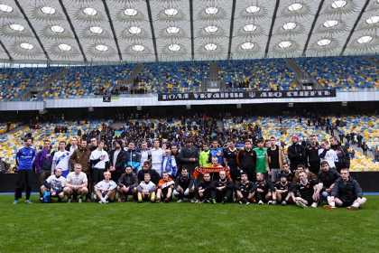 Встреча болельщиков, посвященная единению Украины, закончилась со счетом 1:1. Гостями матча стали известные игроки — Александр Шовковский, бывший вратарь киевлян и сборной Украины, и Владимир Езерский.