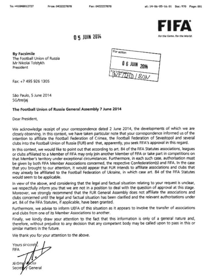 Мы подтверждаем получение Вашего письма от 2 июня 2014 года, развитие событий по которому мы тщательно отслеживаем. В этой связи мы приняли во внимание, что в частности Ваше письмо проинформировало нас о намерении аффилировать Федерацию футбола Крыма, Федерацию футбола Севастополя и несколько клубов в Российский футбольный союз (РФС) и что Вы, очевидно, просите одобрения ФИФА в этой связи.