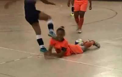 Футболистка одной из команд Леандра не сумела сдержать эмоции и ударила ногой по голове лежащую соперницу Моник.