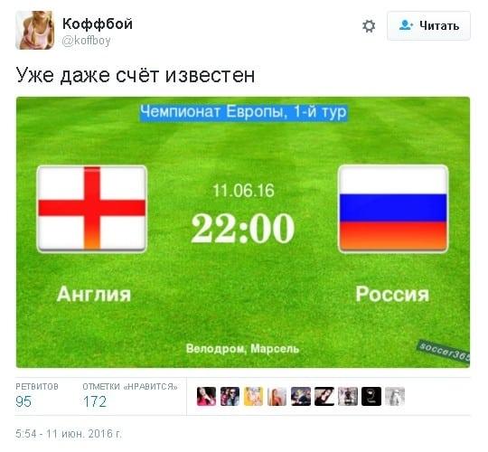 В интернете набирает популярность прикол с анонсом матча чемпионата Евро-2016 между сборной Англии и России. Комментаторы интерпретировали время начала игры (22:00) в счет, с которым завершится встреча.
