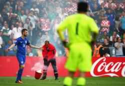 Матч близился к концу, и сборная Хорватии еще удерживала преимущество в счете в один мяч, когда из одного из секторов, где располагались хорватские болельщики, на поле полетели горящие файеры. Пока на поле работали стюарды, убиравшие брошенный мусор, выяснилось, что в том же секторе, откуда полетела на поле пиротехника, началась потасовка между хорватами, из-за чего часть сектора стала пустой. Кроме того, один из стюардов, наклонившись прямо над брошенным на поле предметом, оказался оглушен взрывом, это оказалась петарда, которая сработала в тот момент, когда работник стадиона наклонился, чтобы убрать ее с поля.
