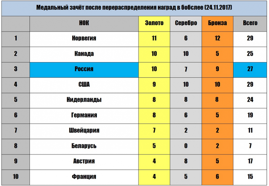 Международный Олимпийский комитет в пятницу, 24 ноября, официально лишил РФ двух золотых медалей, полученных на Олимпиада в Сочи 2014 года. Их завоевал бобслеист Александр Зубков, которого признали виновным в нарушении антидопинговых правил. Таким образом в медальном зачете россияне оказались на третьем месте, а пальму первенства одержала сборная Норвегии. Второе место у Канады.