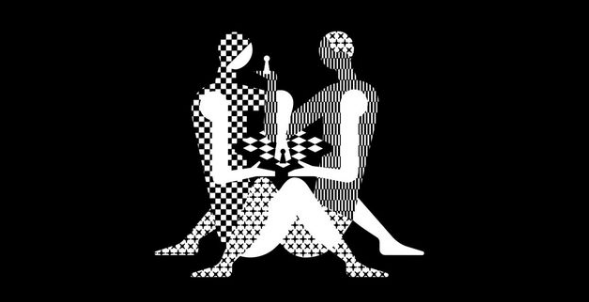 Логотип выполнен в черно-белых тонах. На рисунке изображены два человека с переплетенными руками и ногами, которые держат шахматную доску. Логотип разработало московское дизайн-бюро "Щука".