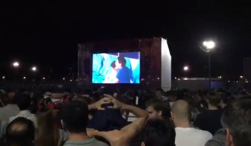 На видео запечатлены радостные возгласы болельщиков, когда российский игрок забивает гол. Зато когда хорватская сборная забила решающий мяч в пенальти, на площади повисла гробовая тишина.
