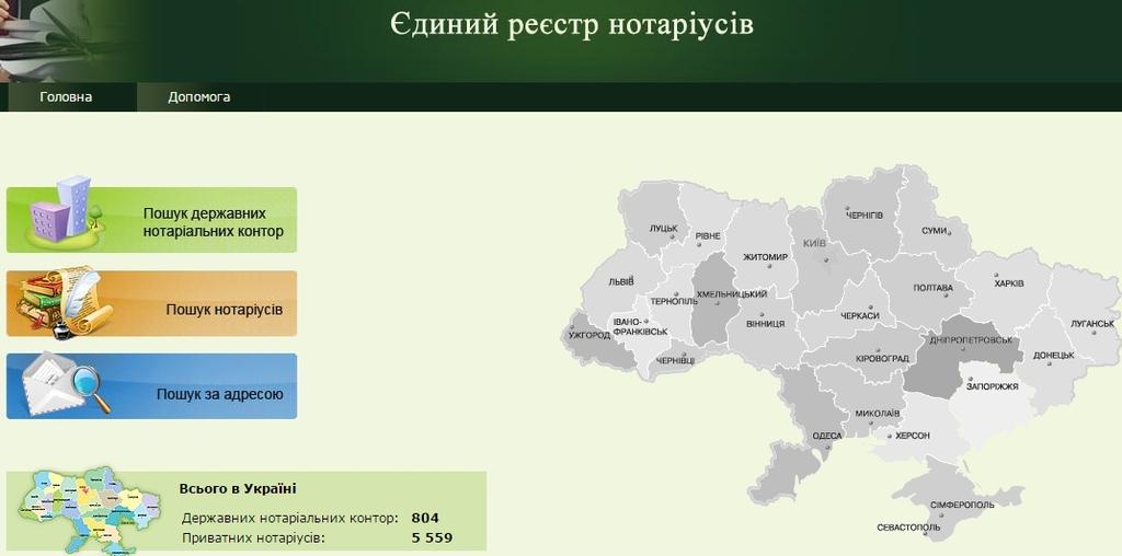 База данных, в которой содержатся сведения о государственные нотариальные конторы, государственные нотариальные архивы и нотариусов Украины.