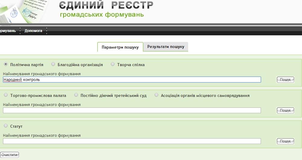 - Дополнительные параметры: статус общественного объединения (всеукраинское, международное, местное и др.), направленность (молодежное, профессиональное, правозащитное и др.), вид (общественная организация, профсоюз, кредитный союз)