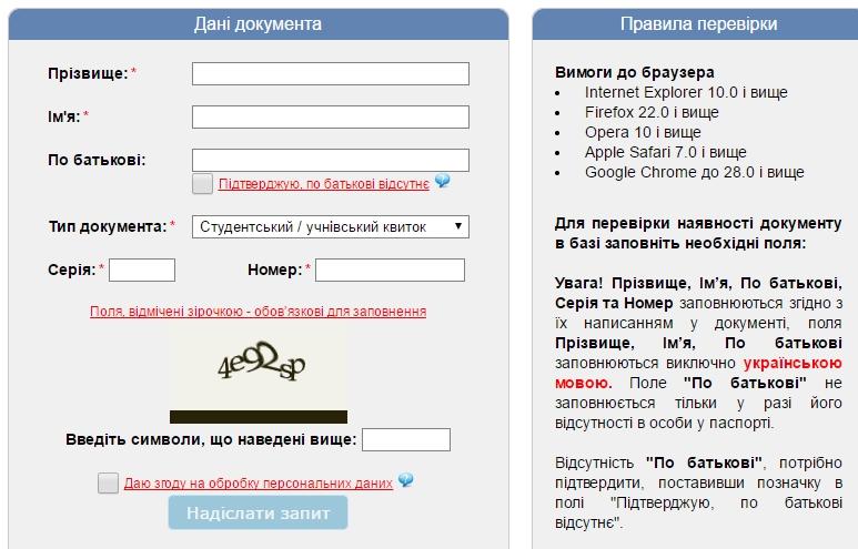 Возможен поиск документов об образовании и студенческих (ученических) билетов в единой государственной базе по вопросам образования. Проверяются документы о высшем и профессионально-техническом образованим, выданные после 01.06.2015 г., кроме изготовленных фотокомпьютерным способом, а также студенческие/ученические билеты.