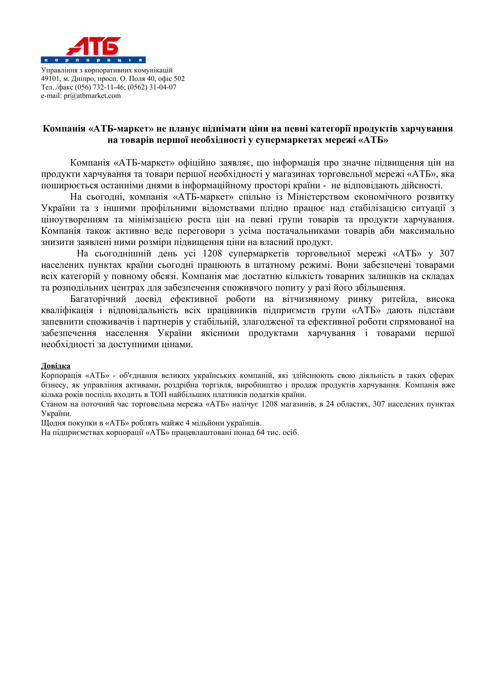 Як зазначається, компанія «АТБ-маркет» спільно із Мінекономіки та з іншими профільними відомствами плідно працює над стабілізацією ситуації з ціноутворенням та мінімізацією роста цін на певні групи товарів та продукти харчування. Компанія також активно веде переговори з усіма постачальниками товарів, аби максимально знизити заявлені ними розміри підвищення ціни на власний продукт.