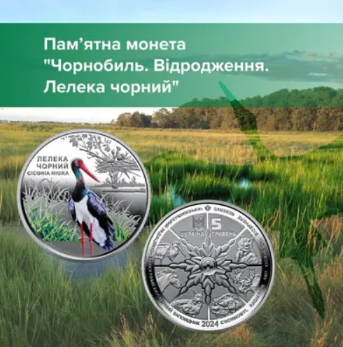 Нацбанк України ввів в обіг монету "Лелека чорна" до 38-ї річниці аварії на ЧАЕС. Вона належить до серії монет із циклу "Чорнобиль. Відродження". Монета виконана з нейзильберу - сплаву, що містить мідь, нікель та цинк.