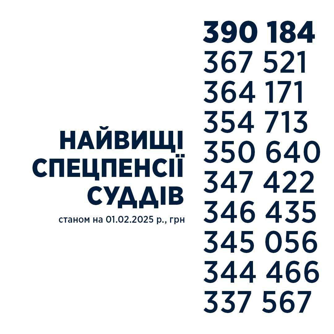 - Судді — абсолютні лідери за розміром пенсій. Найвища зафіксована виплата — 390 тис. грн щомісяця. Умовне 20-те місце в рейтингу — 320 тис. грн.