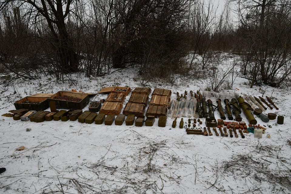 Загалом зі схованки вилучено міни 82 мм, снаряди ВОГ різних модифікацій, деякі зі слідами переробки, гранати РГД-5 та Ф-1 із запалами, РПГ різних модифікацій, снаряди до РПГ та стартові двигуни до них, реактивний піхотний вогнемет, тротилові шашки, снаряди та патрони різних калібрів.