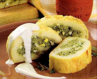 - Картопляну масу викладіть на харчову плівку шаром в 2 см у формі прямокутника. На його середину викладіть начинку та поверніть рулет, поступово видаляючи плівку.