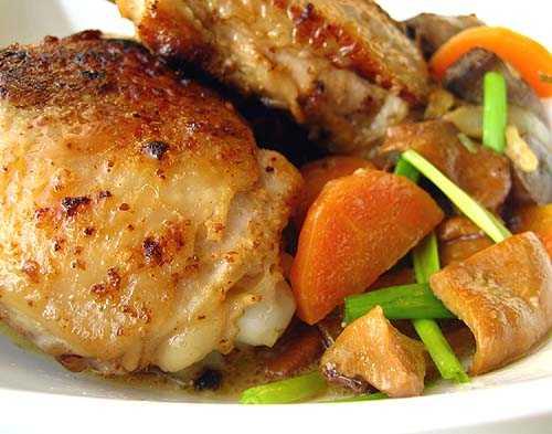 Цей рецепт із серії швидких та смачних. Крім того, не потрібно додатково робити гарнір: досить тушкованих овочів з грибами. А для того, щоб страва була більш дієтичнішою, необхідно перед приготуванням зняти шкіру зі стегенець і не додавати сметану.