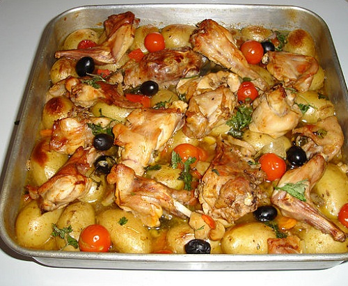 - Картоплю нарізати крупно, а помідори дрібно і теж викласти до Кролика. Скропити оливковою олією, додати вино і випікати в духовці при 160-180 градусах.