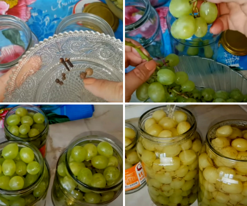 В першу чергу слід простерилізувати банки і кришки: можна це робити старим способом або у мікрохвильовці новим методом. Підготуємо виноград, візьмемо сорт без кісточок зелений і промиємо проточною водою. Далі приготуємо дві літрових банки, одну півлітрову і кладемо спеції за рецептом: на літрову банку 2 запашних перця, 2 гвоздики і 4-5 горошин чорного перцю. У півлітрову банку спеції ділимо рівно навпіл.