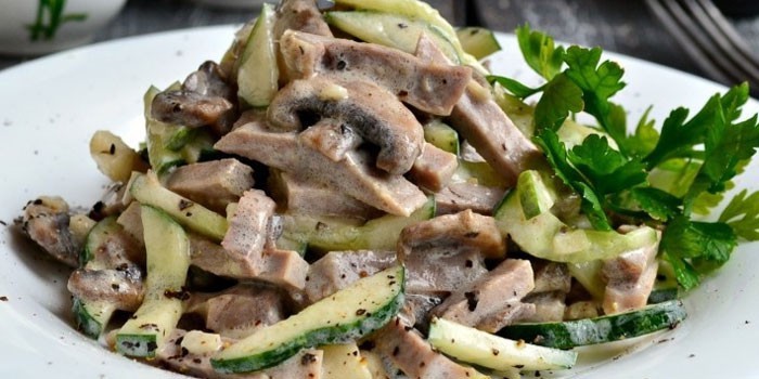 Свинячий або яловичий язик вважається делікатесом через ніжного м'яса, високого вмісту вітамінів і мінералів. Він багатий залізом, тому корисний при анемії, вагітності та в післяопераційний період. Крім того, будь-який салат з приготованим язиком дуже ефектно буде виглядати на святковому столі.