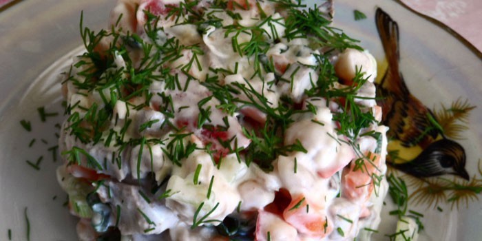 - Вимішуємо в салатнику, приправляємо товченим часником, перцем, сіллю і майонезом.