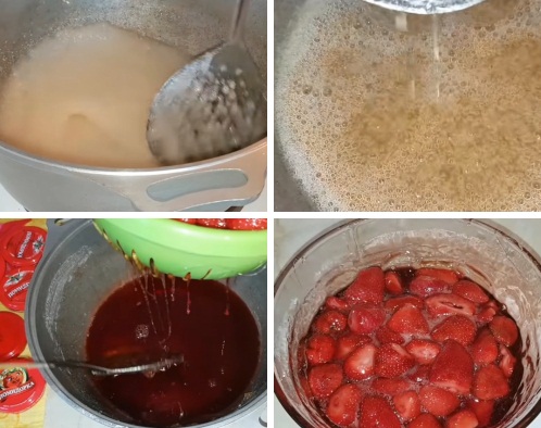 Коли цукрова суміш закипіла, відправляємо в неї лимонну кислоту і варимо 13-15 хвилин, не більше. На першому етапі сироп виходить загуслий, як штучний мед. Висипаємо ягоди в термостійкий або скляний посуд і заливаємо гарячим сиропом. Відставляємо у бік на 15-20 хвилин настоятися, полуниця повинна пустити сік.