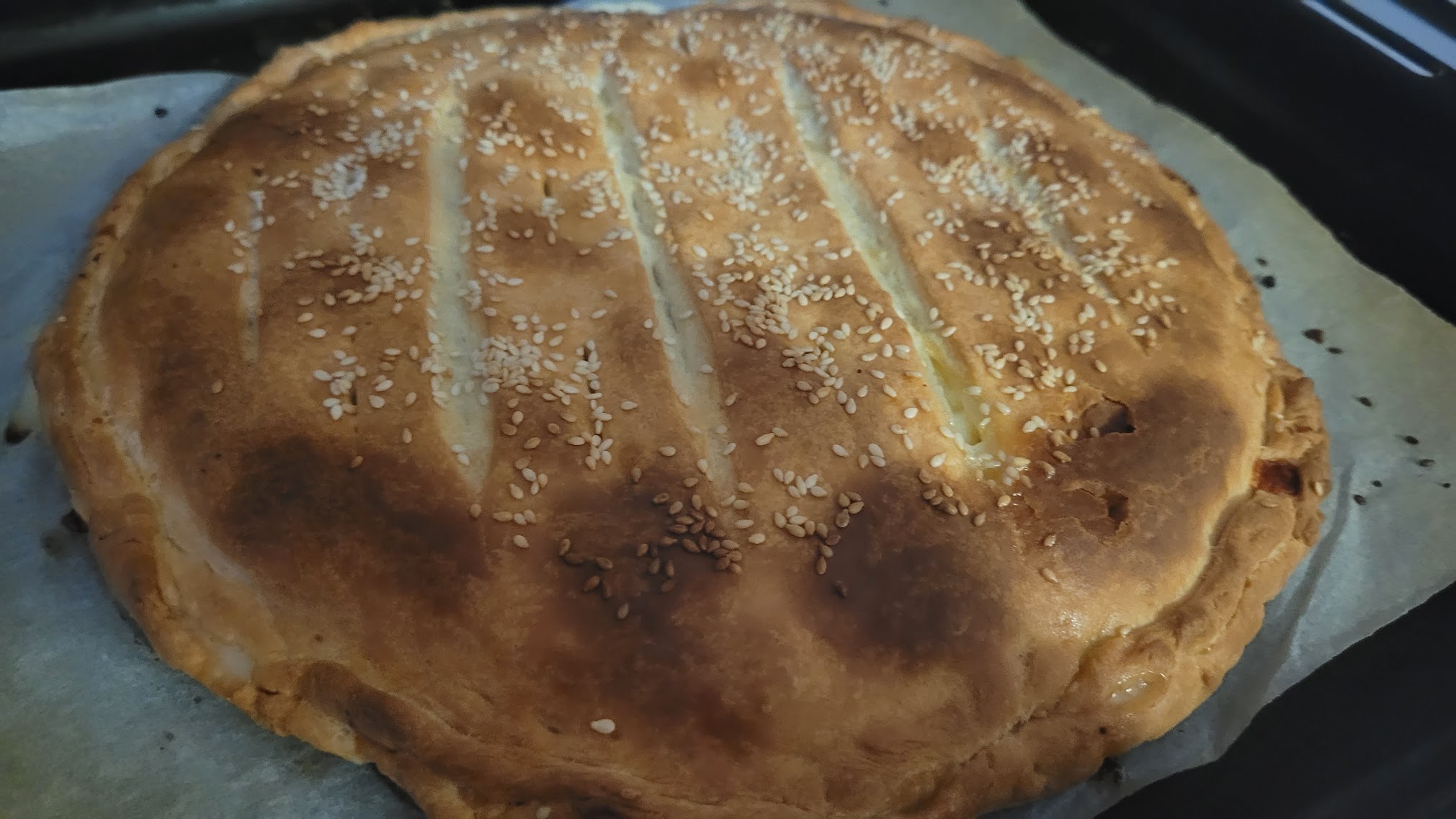 Перенесіть тісто з начинкою на пекарський лист, покритий папером для випікання.Надріжте ножем зверху, щоб виходив пар. Присипте кунжутом чи чорним тмином. Випікайте 20-25 хвилин, поки не стане рум'яним.