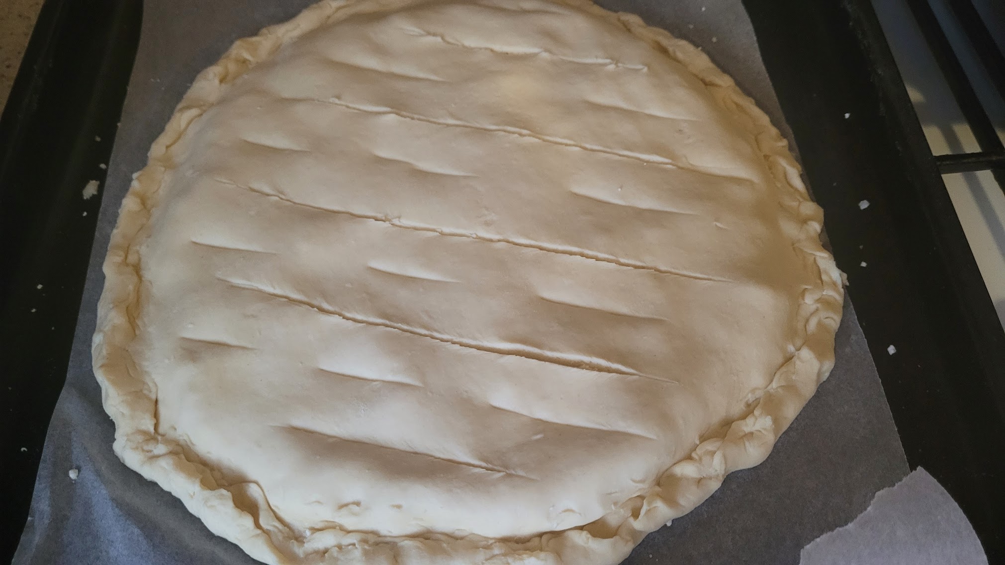 Покрийте начинку іншим кругом тіста та притисніть краї, щоб склеїти обидва шари тіста.