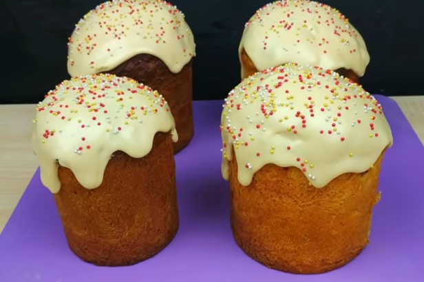 Паперові форми на 1/3 заповнюємо тістом, накриваємо їх рушником і даємо час тесту піднятися, після чого відправляємо паски в розігріту духовку на 180 градусів випікатися. Випікати потрібно 30-40 хвилин, все залежить від вашої духовки. Готові паски змащуємо глазур'ю (купленою або приготовленою самостійно) і прикрашаємо присипкою або цукатами на свій смак. Бажаємо всім світлих великодніх свят і приємного вам апетиту!