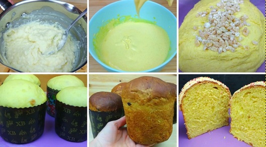 Прийшов час зайнятися тестом. У глибокій мисці з'єднуємо жовткову опару, білкову масу, заварне тісто, після чого поступово починаємо вводити заздалегідь просіяне борошно. Загусле тісто викладаємо на стіл і починаємо вимішувати руками. Готове тісто має трохи липнути до рук, перекладаємо його в глибоку миску, накриваємо харчовою плівкою. За годину, півтори тісто має підійти. По закінченню відведеного часу знову викладаємо тісто на стіл, додаємо в нього заздалегідь запарені родзинки (злегка пересипані борошном) ізлегка вмішуємо його в тісто.