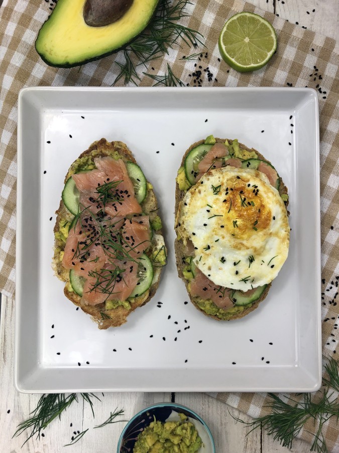 - Підсмажте хліб на грилі, а потім змастіть його у вершковому сирі. Викладіть скибочки авокадо на хліб і приправте перцем і сіллю.