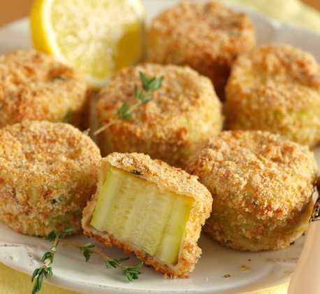 - Можна змішати тільки сухарі з сиром і зеленню й вмочати кабачки спочатку в борошно, потім у білок, а потім у сухарі.